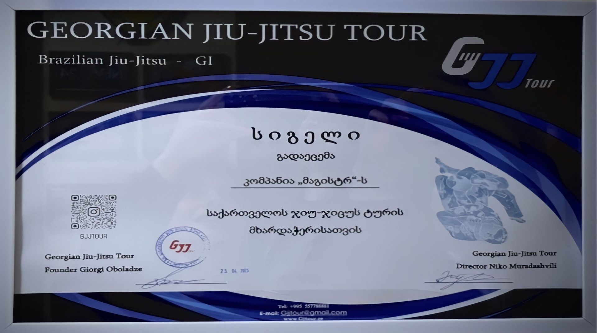 მიმდინარე წლის 23 აპრილს თბილისში გამართულ GJJ Tour (Georgian Jiu-Jitsu Tour)-ის მიერ ორგანიზებულ რიგით მე-5 ტურნირზე დაცვის კომპანია მაგისტრს გადაეცა მადლობის სიგელი საქართველოს ჯიუ-ჯიცუს ტურის მხარდაჭერისთვის