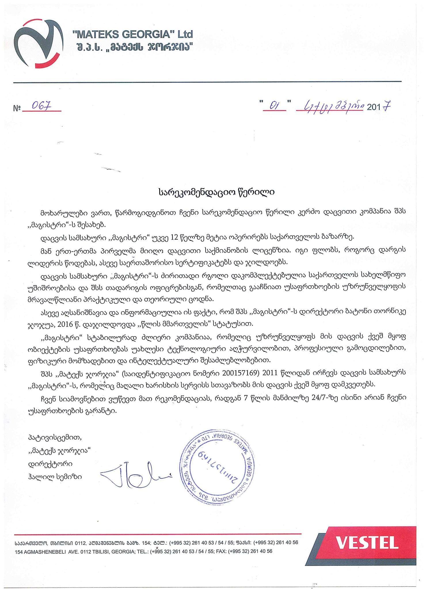 მოხარულები ვართ წარმოგიდგინოთ ჩვენი სარეკომენდაციო წერილი კერძო დაცვითი კომპანია შპს “მაგისტრის” შესახებ.