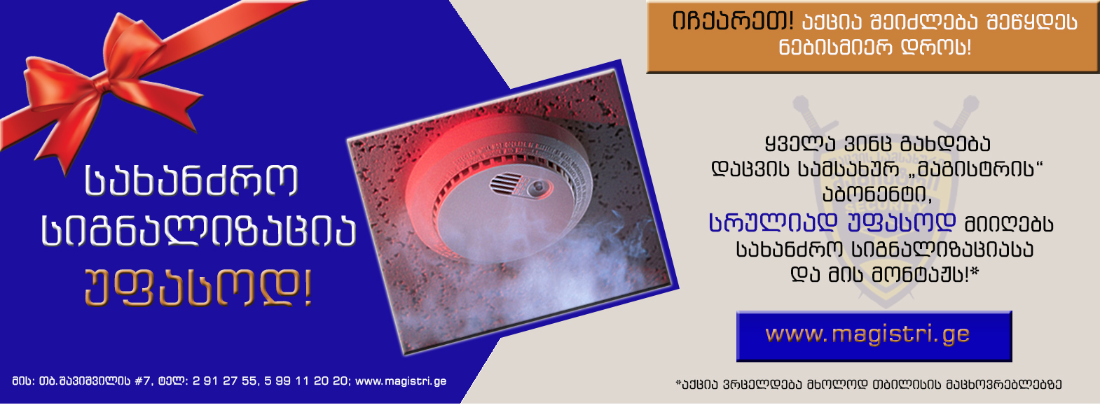 აქციის ფარგლებში, ყველა ვინც გახდება „მაგისტრის“ აბონენტი ან პორტირდება, სახანძრო სიგნალიზაციასა და მის მონტაჟს მიიღებს სრულიად უფასოდ!