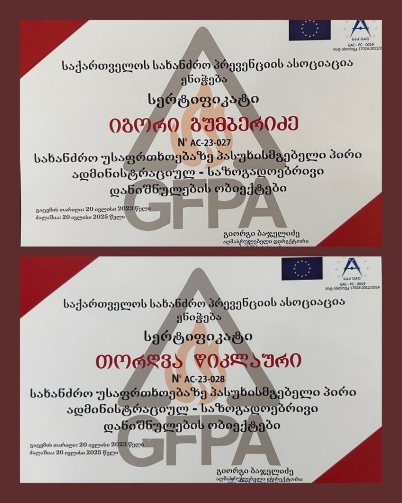 სახელმწიფო აკრედიტირებული სერთიფიკატიივნისი 28th, 2021 ტექნიკური ჯგუფის თანამშრომლებს საქართველოს სახანძრო პრევენციის ასოციაციის მიერ მიენიჭათ სახელმწიფო აკრედიტირებული სერთიფიკატი ამიერიდან ისინი ისარგებლებენ სახანძრო უსაფრთხოებაზე პასუხისმგებელი პირის ოფიციალური ლიცენზიით სახანძრო სიგნალიზაციის მომსახურებით დაინტერესების შემთხვევაში დაგვიკავშირდით: 599112020 კონსულტაცია უფასოაგაზიარება